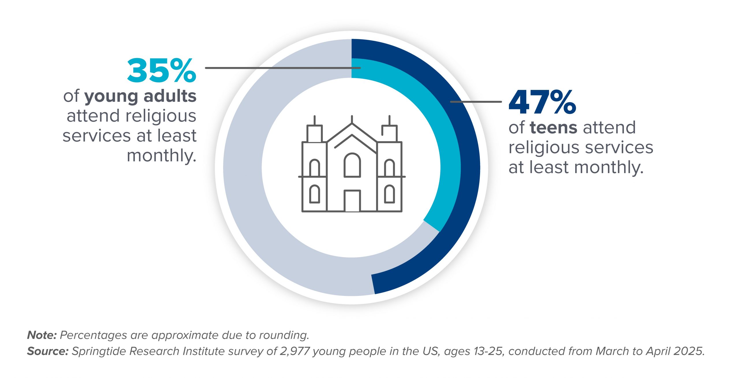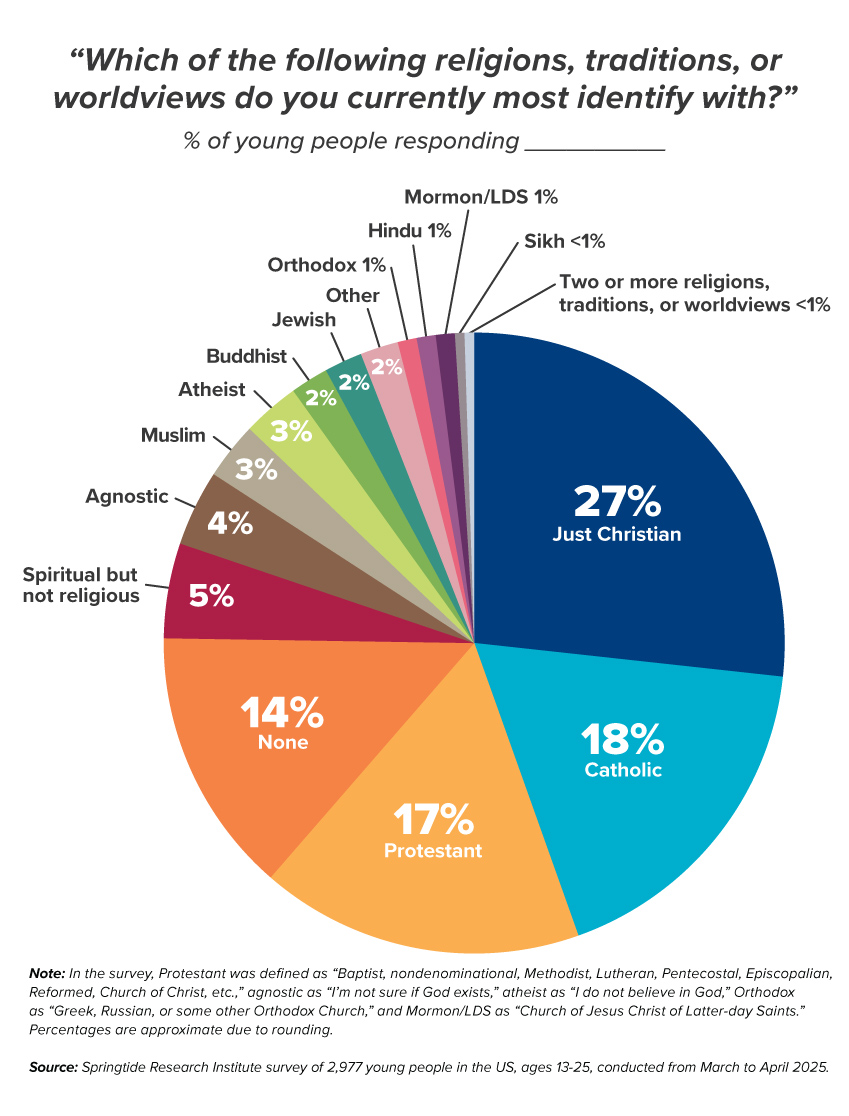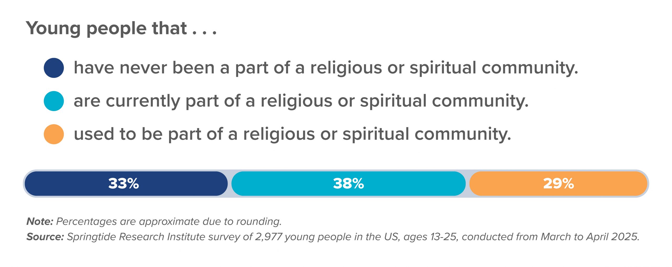 In 2025, Springtide Research Institute surveyed 2,977 young people, ages 13–25, from across the United States to learn about four key dimensions of their spiritual and religious lives: belief, identity, practice, and community. Their responses reveal that religion remains important to most young people and that many continue to identify with the religious tradition in which they were raised. While the majority of young people don’t regularly attend worship services, they are still connected in some capacity to religious communities.